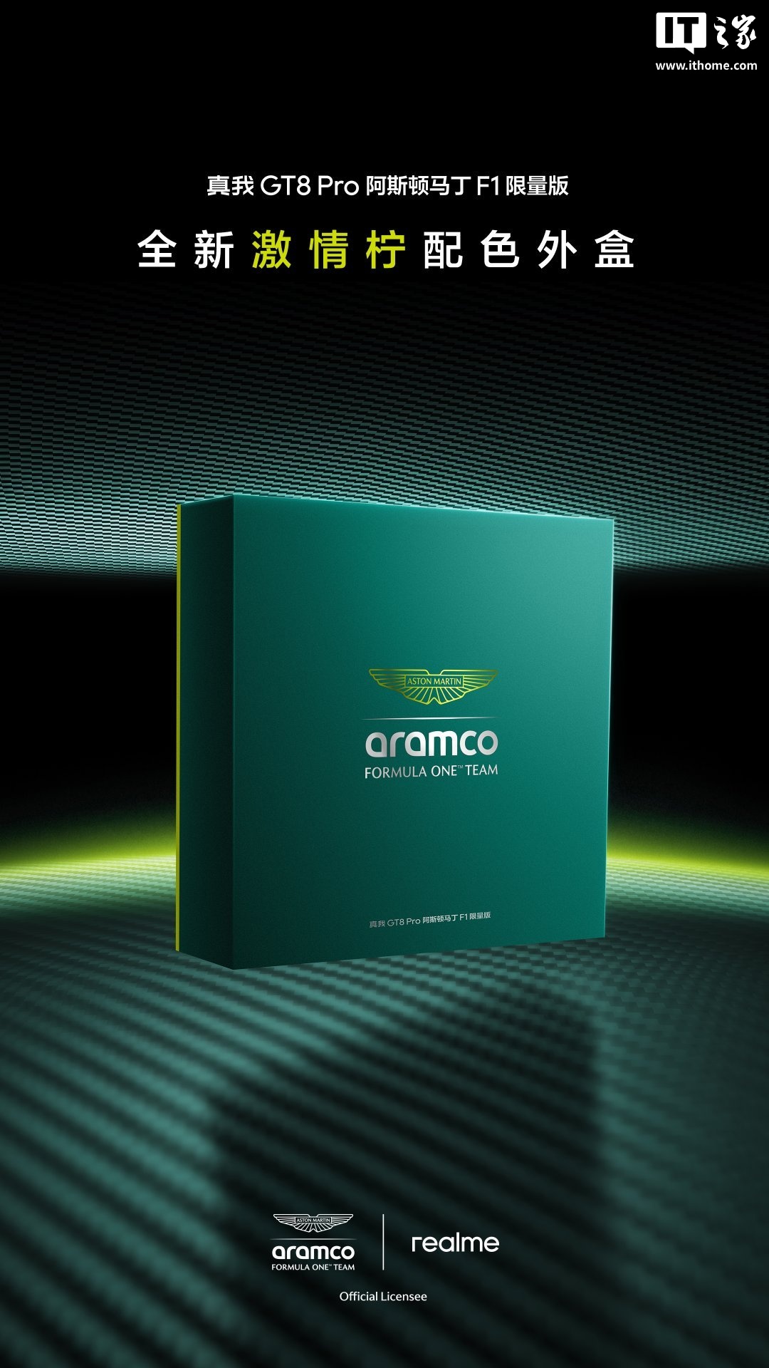 realme 真我 GT8 Pro 阿斯顿马丁 F1 限量版手机将于 11 月 10 日开售,新机采用机械拼装设计的定制镜头模组,碳纤维纹理方圆 Deco(相机装饰);激情柠撞色致敬车队同款配色方案,配备 F1 车队同款银翼徽标;双翼空气动力学曲线,新增凹痕工艺过渡,握持感更舒适贴手;赛车金属漆感玻璃后盖,一体同色金属中框。