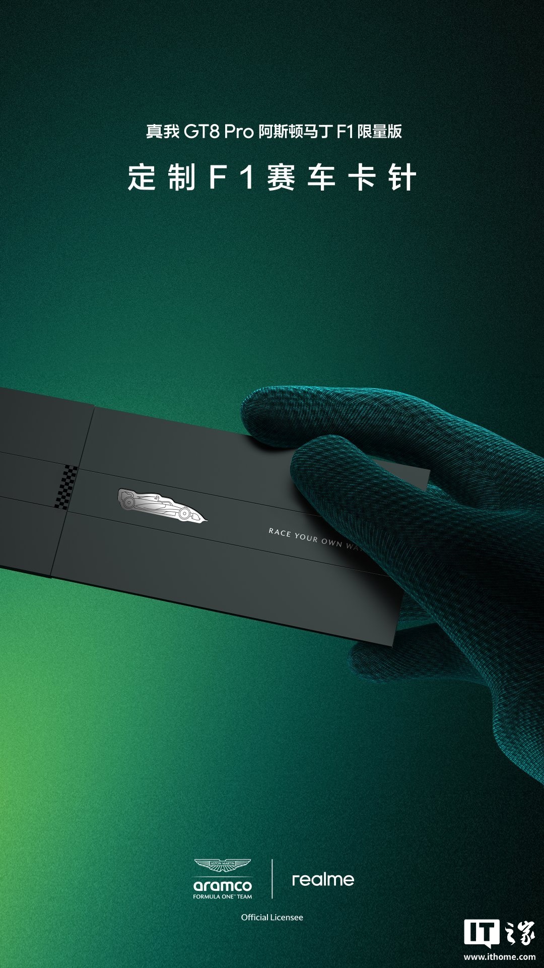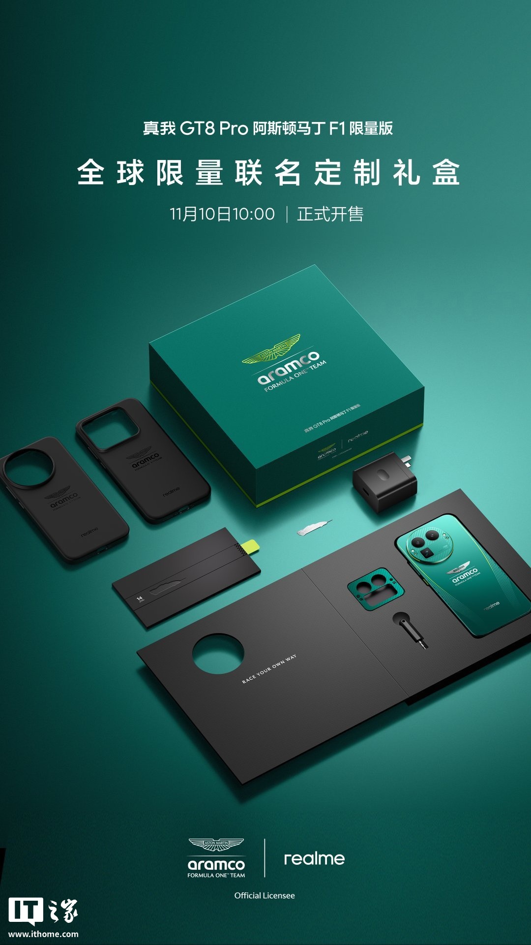alixixi 11 月 4 日消息,realme 真我 GT8 Pro 阿斯顿马丁 F1 限量版手机定制礼盒今日公开,据真我 realme 副总裁、全球营销总裁、中国区总裁徐起介绍,该机采用收藏品级别的设计,自带阿斯顿马丁 F1 限定版方、圆两款 Deco 和对应定制手机壳,就连卡针也做了单独设计定制。