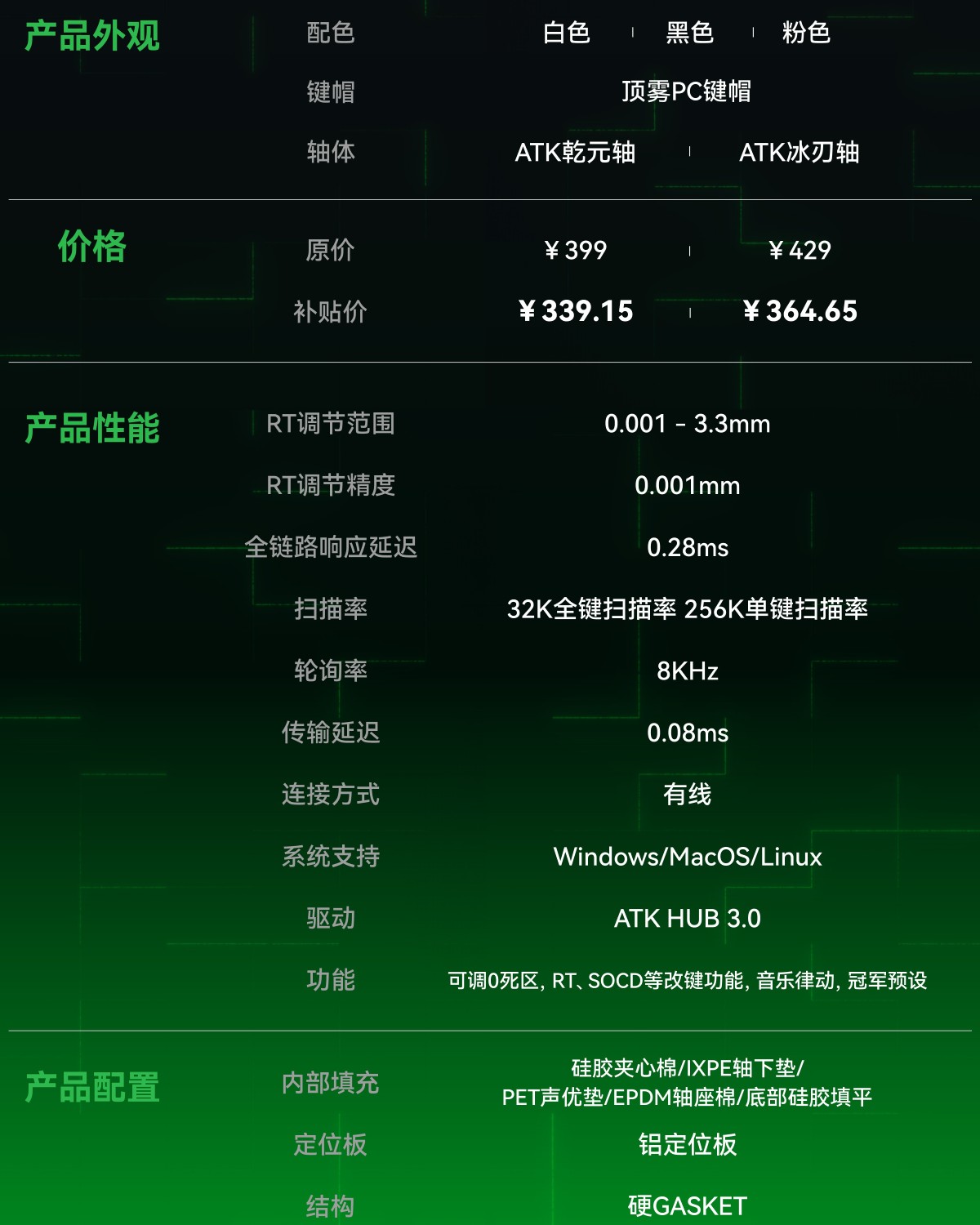 ATK RS6 Air 键盘已在电商平台上架,原价 399 元起,计算 15% 国家补贴后到手价为 339.15 元起。