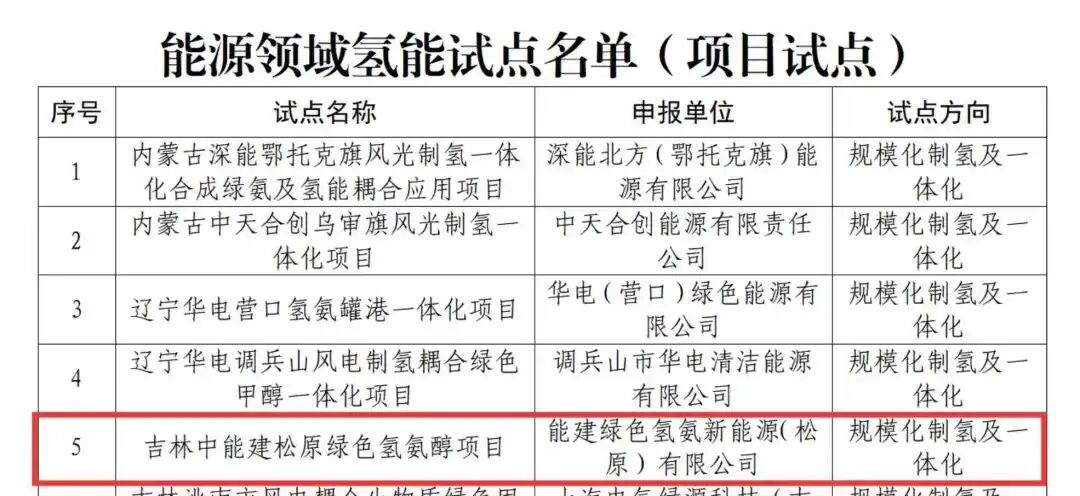 近日,国家能源局公示第一批能源领域氢能试点名单,包括41个项目试点、9个区域试点,中能建松原氢能产业园(绿色氢氨醇一体化)项目成功入选项目试点,是松原项目继入选国家发改委首批绿色低碳先进技术示范项目、国家能源局首批绿色液体燃料技术攻关和产业化试点项目、全球能源互联网示范项目后又一国家级氢能领域试点项目。