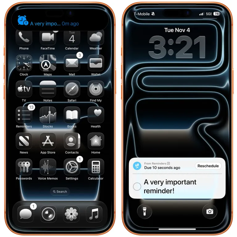 闹钟触发时,用户可选择“贪睡”或“滑动停止”,锁屏界面将显示倒计时与“完成”或“重新安排”选项。提醒事项闹钟以蓝色区分于普通闹钟。