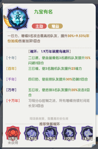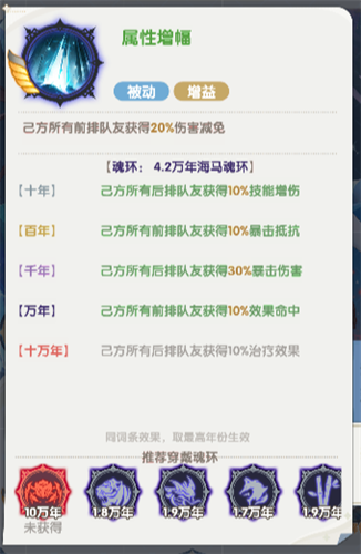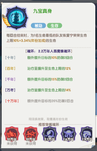 每回合结束时,为1名生命最低的队友恢复宁荣荣生命上限10%+(年份加成)的生命