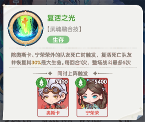 除奥斯卡、宁荣荣外的队友死亡时触发,复活死亡队友并恢复其30%最大生命。每回合1次,整场战斗最多5次