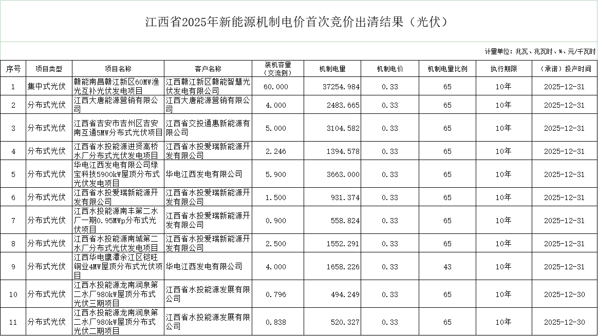 经公开竞价和结果公示,2025年江西省新能源机制电价竞价结果为:风电项目机制电量为4.62亿千瓦时,机制电价为0.375元/千瓦时(含税,下同);光伏项目机制电量为1.31亿千瓦时,机制电价为0.330元/千瓦时。