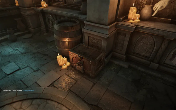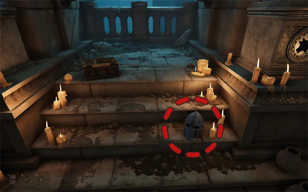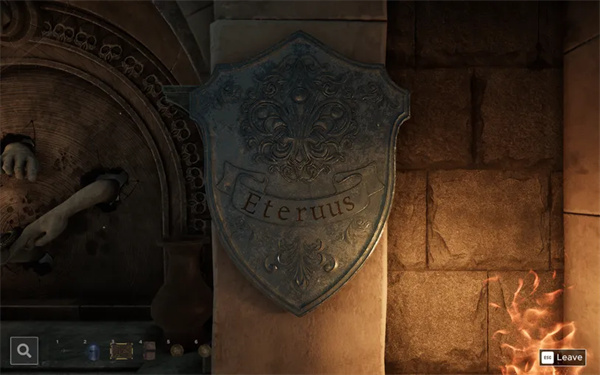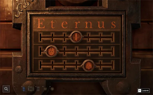 检查地上的箱子。箱子上有带有倒置剑、头盔和盾牌图像的滑块。环顾房间,你会发现这三个物品上都标有“Eternus”字样。