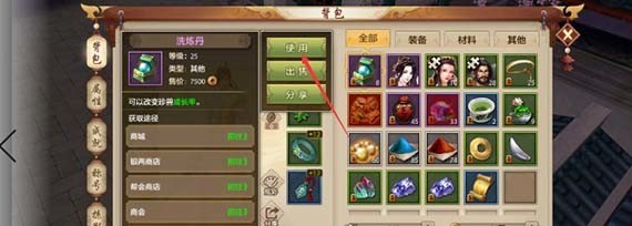 2、打开背包后,接着再在背包栏中找到道具【洗练丹】后进行点击。