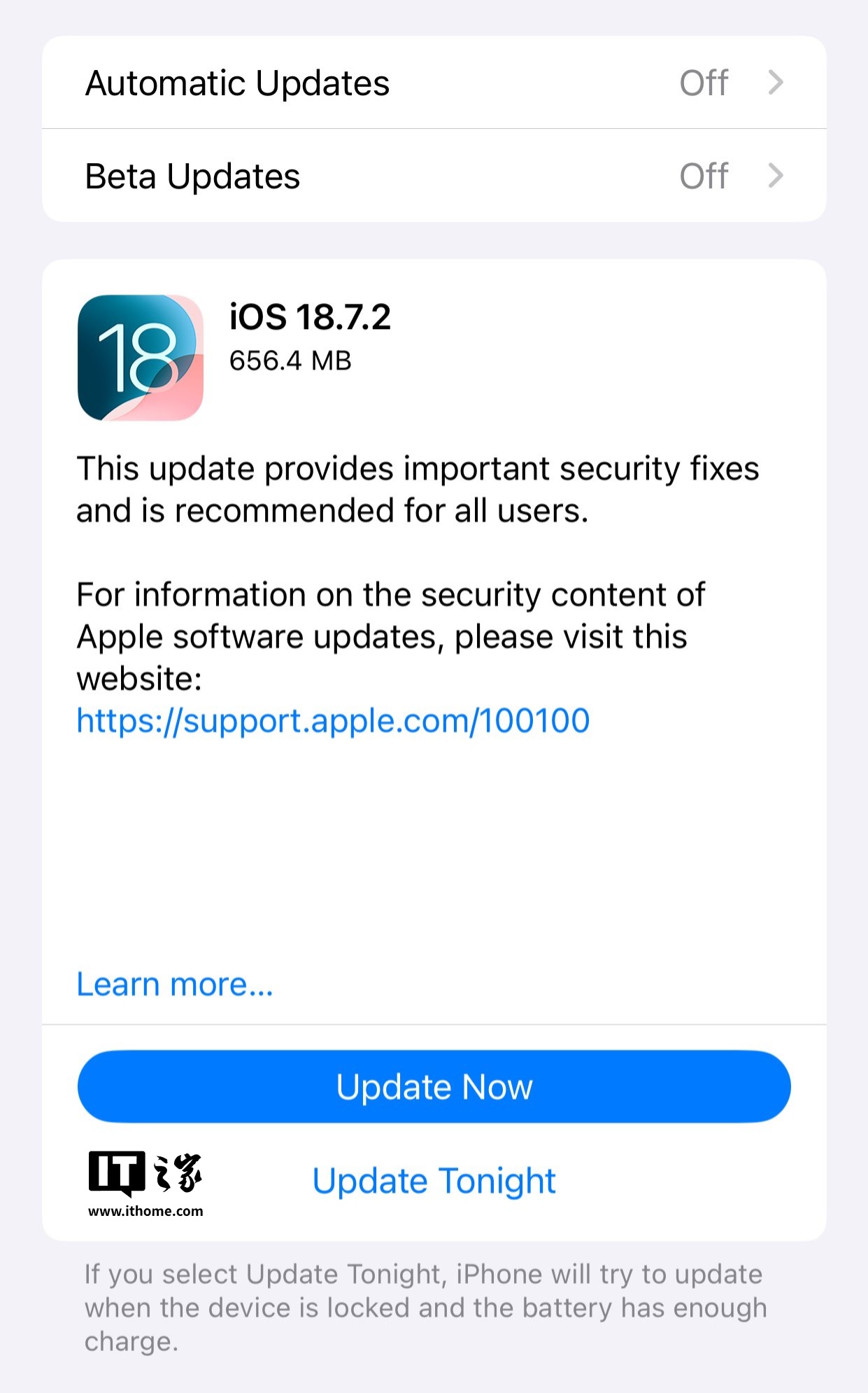 苹果公司在 iOS / iPadOS 18.7.2 更新日志中,仅提及“本次更新提供了重要的安全修复,建议所有用户进行更新。”