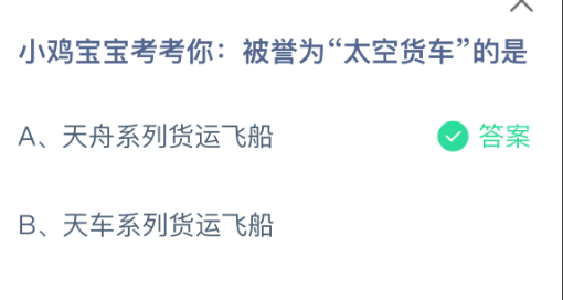以上就是小鸡宝宝考考你:被誉为“太空货车”的是,支付宝蚂蚁庄园2025年11月6日答案最新,更多精彩内容,请点击关注阿里西西手游网更新!