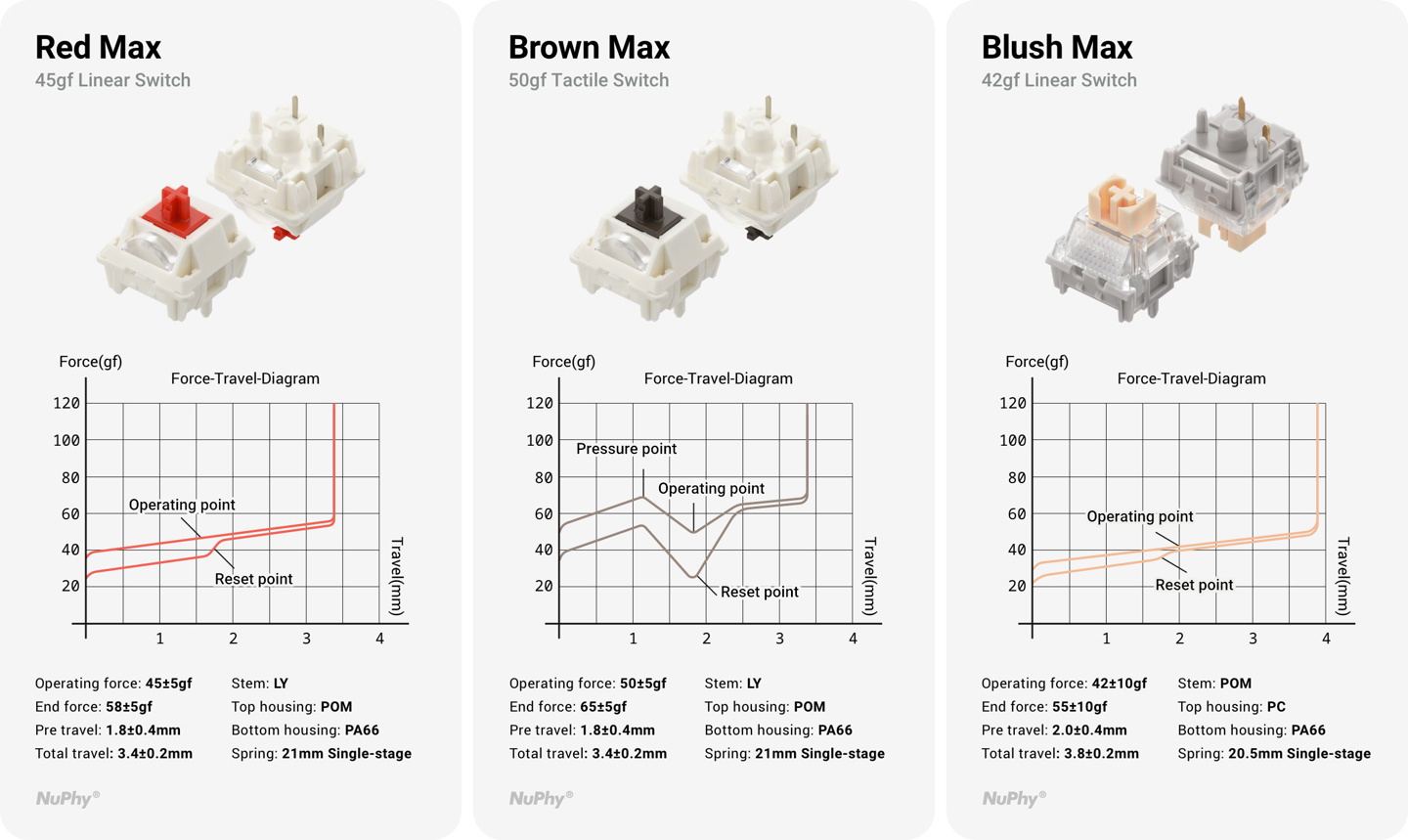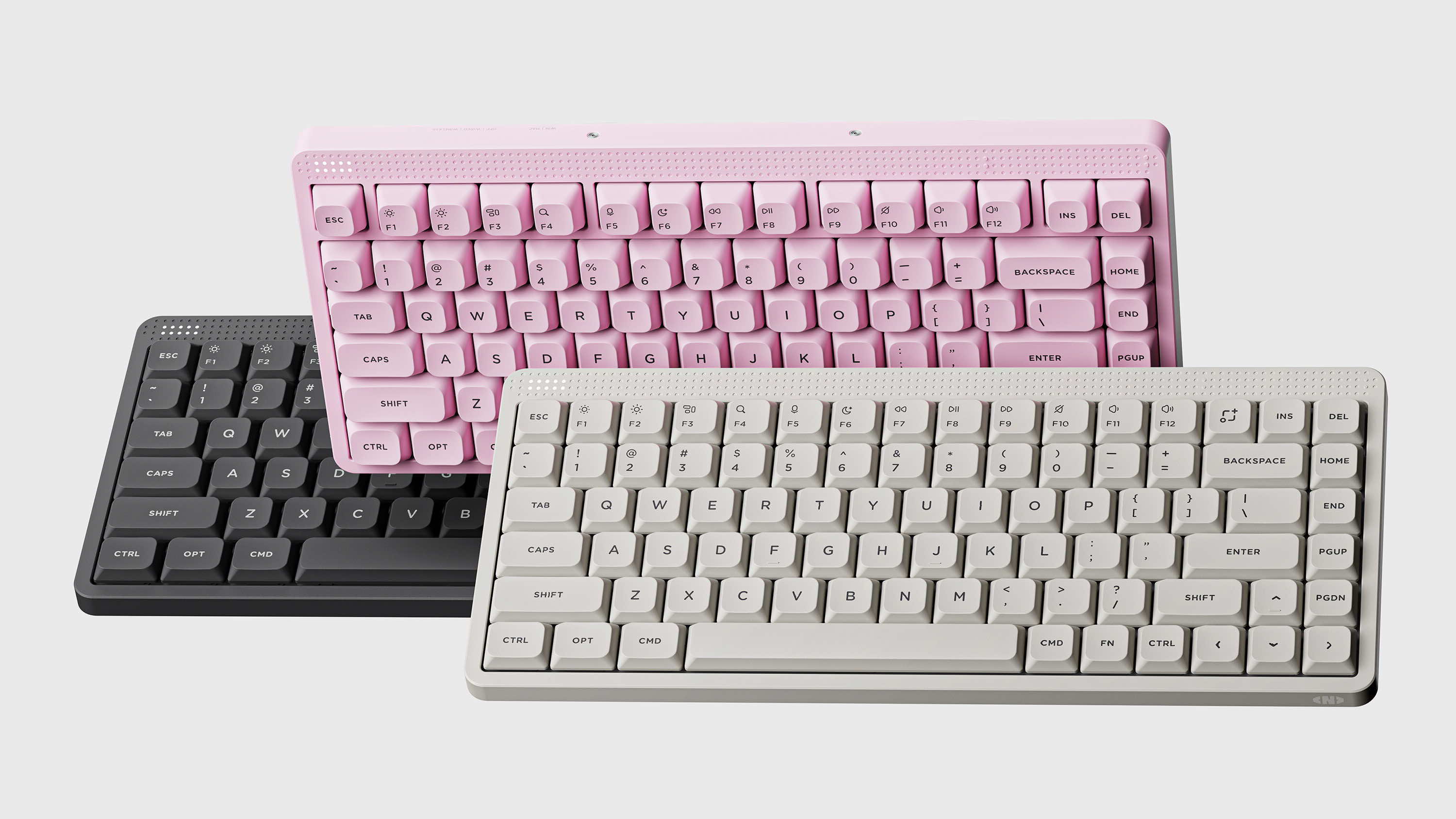 NuPhy Node 75 键盘具有月白、莹粉、曜灰三种配色,包含 Max 高轴(82 键)或 nano 矮轴(84 键)版本,高矮款均提供麻将音超红、石子音超茶、踩雪音黛粉版本轴体选项。