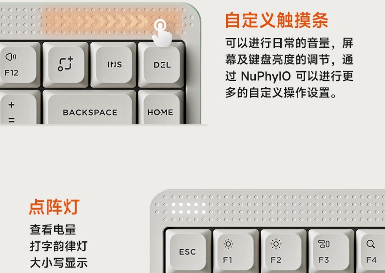 alixixi 11 月 6 日消息,NuPhy 昨日宣布推出 Node 75 系列机械键盘。这批键盘在上部采用点阵美学设计(支持 DIY 扩展兼容配件),右上角为自定义多媒体触控条,左上角的矩阵灯区则可显示电量、大小写或随输入明暗。