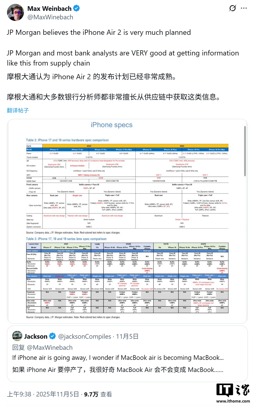 alixixi 11 月 6 日消息,科技媒体 Wccftech 昨日(11 月 5 日)发布博文,报道称华尔街投行摩根大通在最新投资报告中,预测了截至 2027 年的苹果产品规划,明确将 iPhone Air 2 和 iPhone Air 3 列入了发布规划。