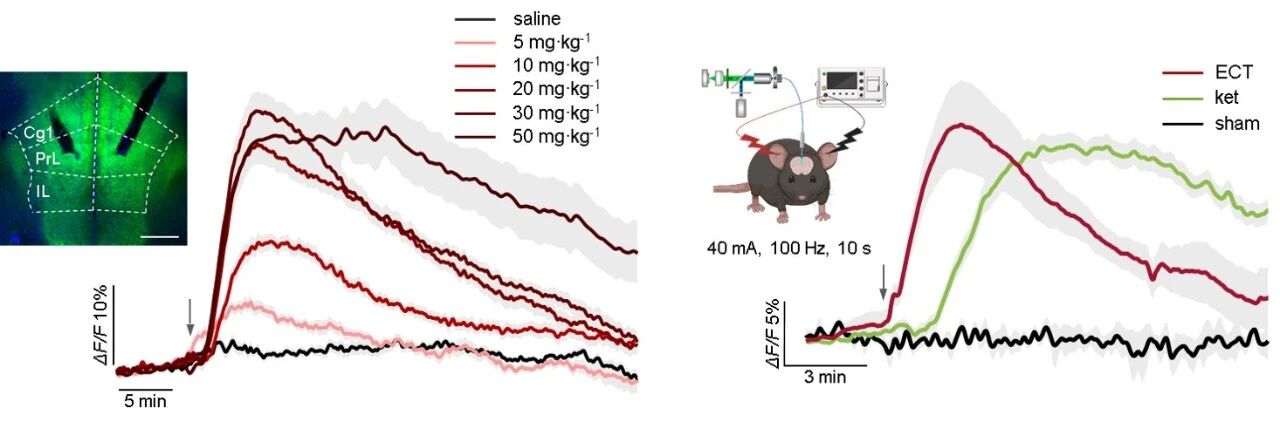 研究者首先利用基因编码的腺苷探针 GRABado,通过光纤光度测量技术,在小鼠体内实现了对特定脑区细胞外腺苷浓度的实时动态监测。研究发现,在给予亚麻醉剂量的氯胺酮后,小鼠内侧前额叶皮层与海马体区域出现了快速且持续的腺苷水平升高,而伏隔核区域则未观察到类似变化。同样,在实施电休克治疗时也观测到了内侧前额叶皮层内类似的腺苷释放。