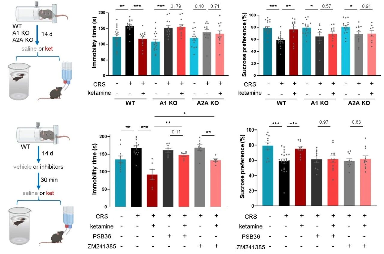 接下来,研究者通过遗传学与药理学手段,确证了腺苷信号对于抗抑郁效应的必要性。在腺苷 A1 受体或 A2A 受体基因敲除的小鼠中,氯胺酮与电休克治疗在强迫游泳实验和糖水偏好实验中所表现出的抗抑郁效应完全消失。在野生型小鼠中,系统性给予 A1 或 A2A 受体拮抗剂,同样能够阻断氯胺酮的抗抑郁作用。重要的是,受体敲除并不影响氯胺酮诱导的腺苷释放本身,也不影响其引起的运动亢进效应,表明腺苷信号通路特异性地介导了其治疗作用,而非非特异性的行为效应。