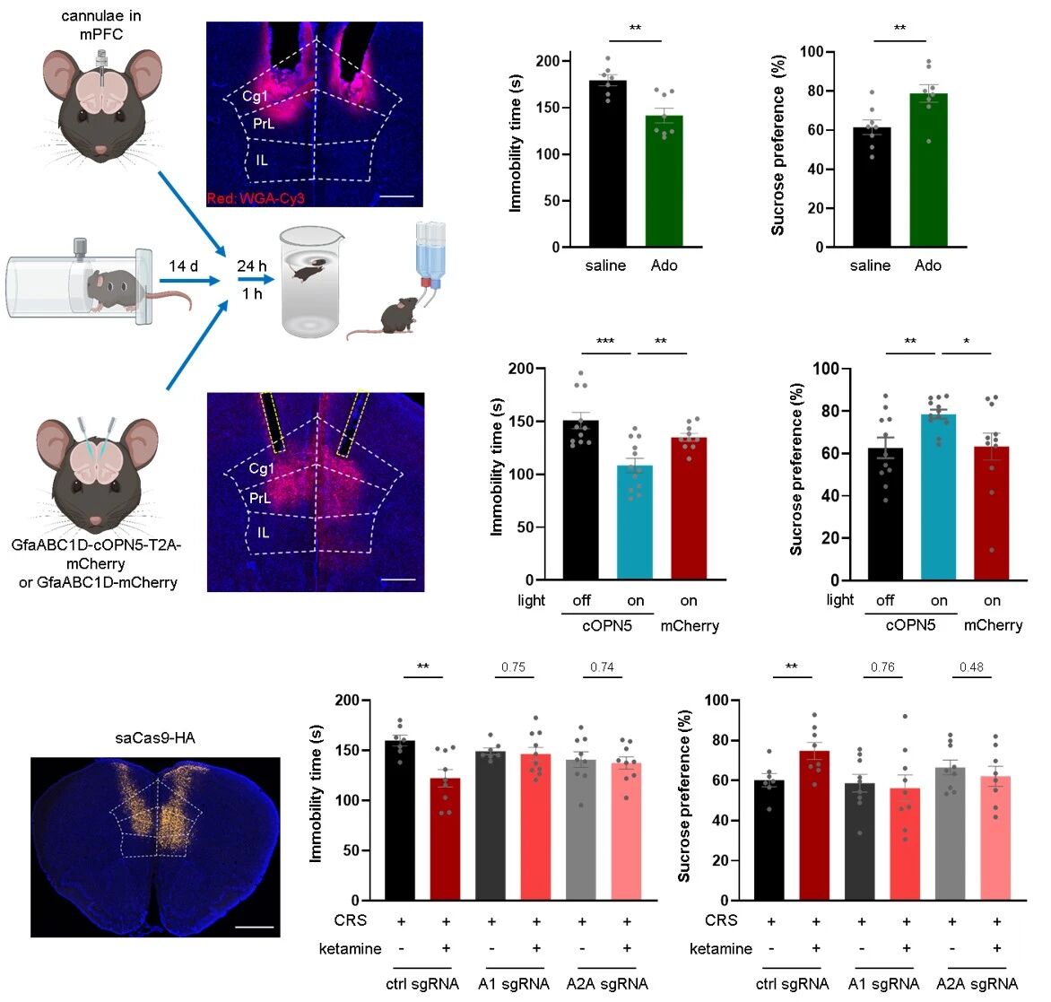 为进一步确定腺苷信号的作用脑区,研究者进行了环路层面的功能验证。实验发现,直接向内侧前额叶皮层内注射腺苷,或利用光遗传学技术特异性激活该区域的星形胶质细胞以诱导内源性腺苷释放,均足以在抑郁模型小鼠中产生快速的抗抑郁行为效应。相反,利用 AAV 介导的 CRISPR / Cas9 技术,特异性在内侧前额叶皮层敲低 A1 或 A2A 受体,则阻断了全身给予氯胺酮所产生的治疗效果。这些结果共同表明,内侧前额叶皮层是腺苷信号介导快速抗抑郁作用的关键节点。