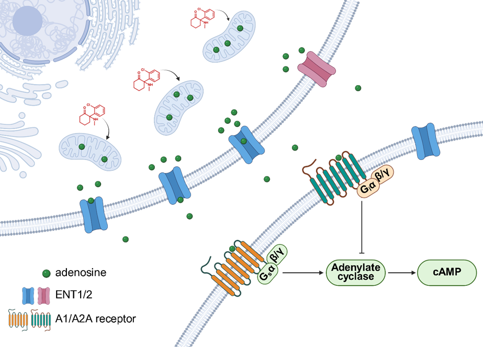 在机制上,研究深入探索了氯胺酮提升细胞外腺苷水平的来源。研究发现,氯胺酮并未引起细胞外 ATP / ADP 水平的升高,且其效应在 CD73 敲除小鼠中依然存在,排除了细胞外核苷酸水解是其主要来源的可能性。进一步实验表明,抑制平衡型核苷转运体 ENT1/2 可显著减弱氯胺酮诱导的腺苷释放,提示其来源为细胞内。利用 ATP / ADP 比率传感器 PercevalHR,研究者观察到氯胺酮能够迅速降低内侧前额叶皮层中兴奋性神经元、抑制性神经元及星形胶质细胞内的 ATP / ADP 比率,且这一代谢变化在时间上早于细胞外腺苷的升高。体外线粒体代谢流分析显示,氯胺酮在治疗相关浓度下可直接抑制线粒体三羧酸循环的代谢通量。这些证据共同勾勒出一条新通路:氯胺酮通过直接调节细胞能量代谢,增加细胞内腺苷,进而通过核苷转运体释放至细胞外。