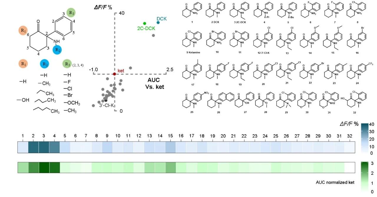 基于对上述机制的深入理解,研究者以“增强腺苷释放”为表型指标,设计并筛选了一系列氯胺酮衍生物。其中,去氯氯胺酮在低剂量下即能诱发更强、更持久的腺苷信号,并在行为学测试中表现出优于氯胺酮的抗抑郁功效,同时其引发的运动亢进副作用显著减弱。值得注意的是,化合物的腺苷释放效能与其对 NMDA 受体的抑制强度并无显著相关性,提示其抗抑郁作用存在独立于 NMDAR 抑制的新机制。