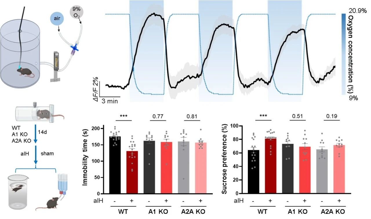 此外,研究者探索了非药物手段提升脑内腺苷的治疗潜力。研究发现,一种可控的急性间歇性低氧干预方案,能够安全地诱发内侧前额叶皮层内的腺苷释放,并在抑郁模型小鼠中产生依赖于 A1 和 A2A 受体的快速抗抑郁效应。