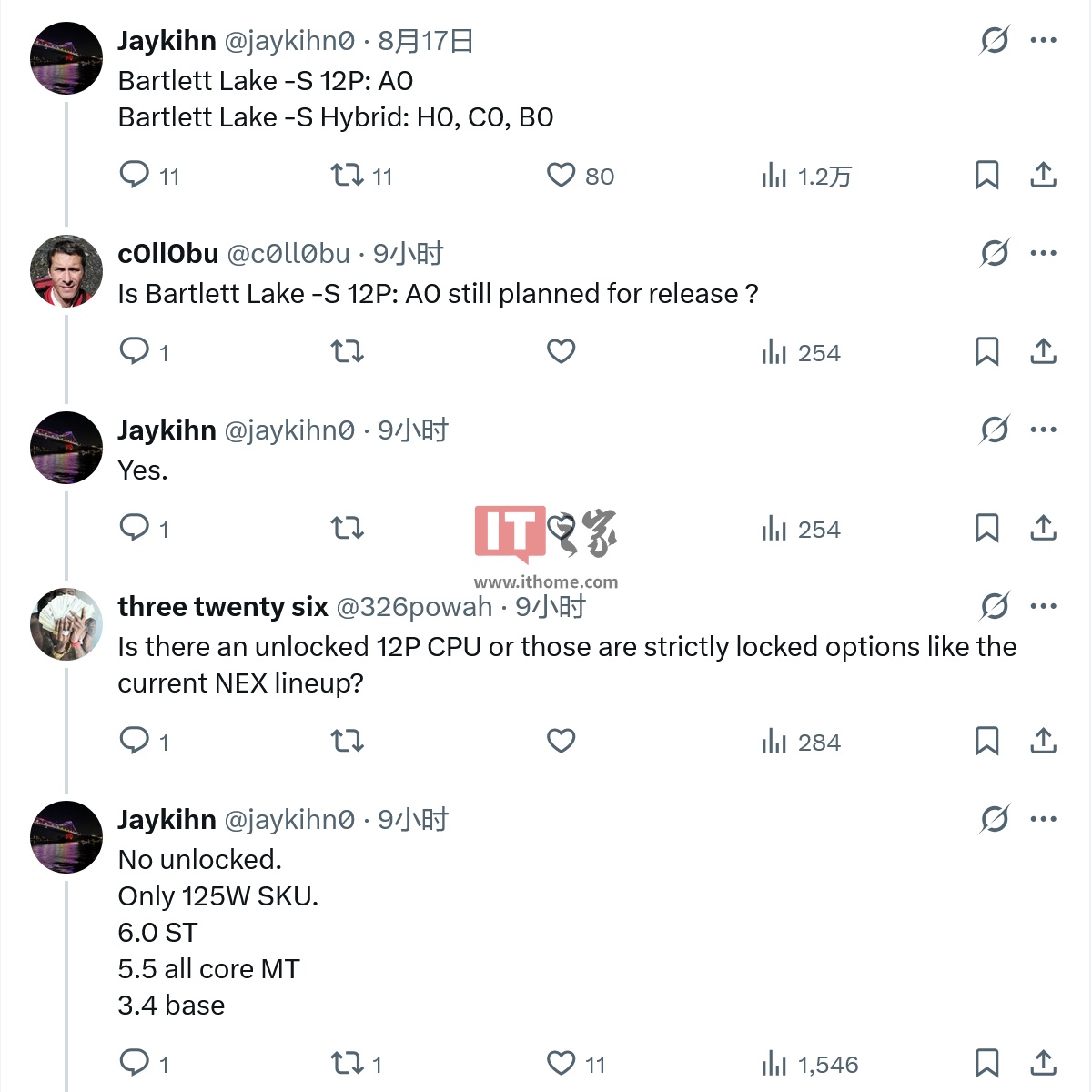 alixixi 11 月 6 日消息,消息人士 @jaykihn0 北京时间今日凌晨就此前有关纯性能核版 LGA1700 平台处理器 "Bartlett Lake S 12P" 的爆料进行了补充更新。