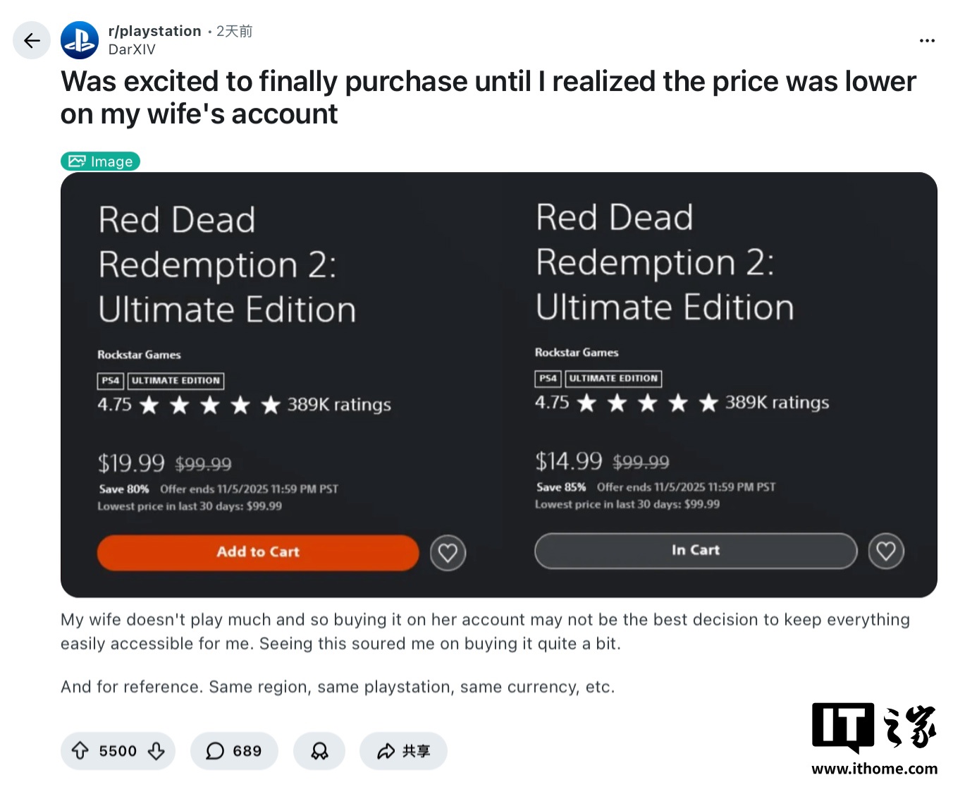 据悉,DarXIV 原本计划在促销期间以 19.99 美元(alixixi注:现汇率约合 142.3 元人民币)购买《荒野大镖客:救赎 2》游戏但切换至其妻子的账号时发现游戏折扣更高,仅 14.99 美元(现汇率约合 106.7 元人民币),两个账号归属区服相同,但价格却存在明显差异。