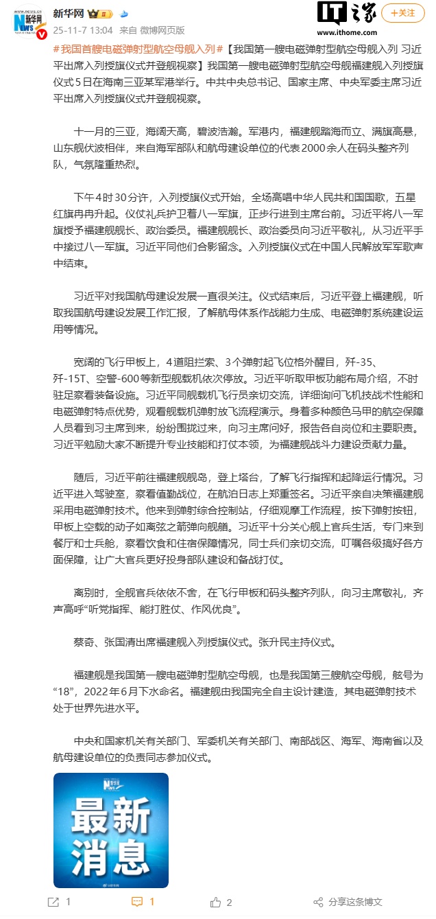 alixixi 11 月 7 日消息,我国第一艘电磁弹射型航空母舰福建舰入列授旗仪式已于 11 月 5 日在海南三亚某军港举行。我国三航母时代正式来临。