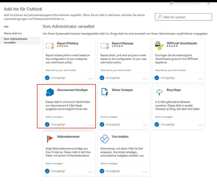 该“取消订阅”加载项并未出现在企业 IT 管理员的已部署加载项管理门户中,意味着管理员可能无法通过常规途径对其进行统一管理或禁用,用户推测该加载项可能是由微软在后台自动部署的。