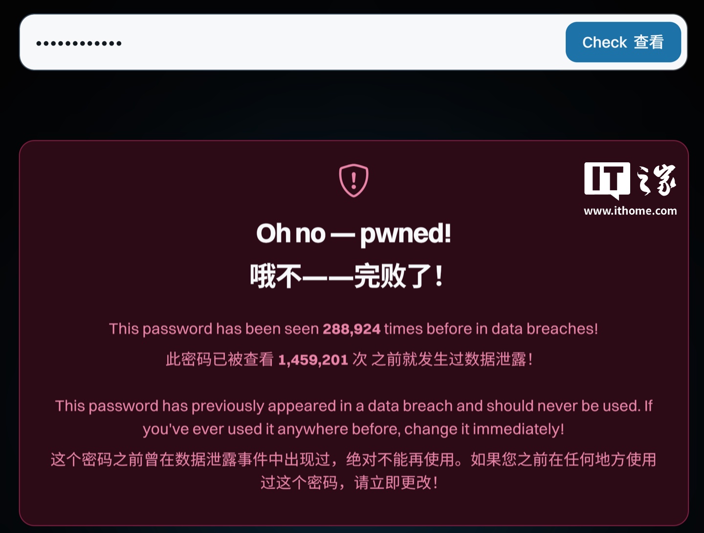 为了帮助用户自查,Hunt 已将这批超过 10 亿的新密码全部上传至其“Pwned Passwords”数据库。用户可以在该页面输入自己正在使用或曾使用过的密码,查询其是否已在泄露事件中曝光。