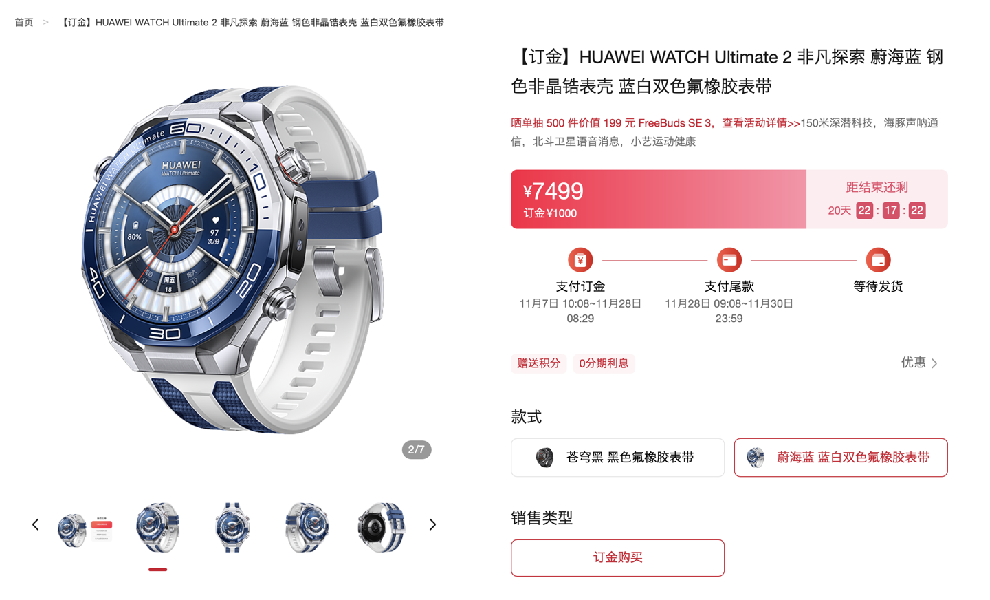alixixi 11 月 7 日消息,据华为终端消息,华为 WATCH Ultimate 2 于今日 10:08 正式在华为商城开启预售,提供两款全新配色,是首款支持北斗卫星语音消息的穿戴设备,其中苍穹黑定价 6499 元,蔚海蓝定价为 7499 元。