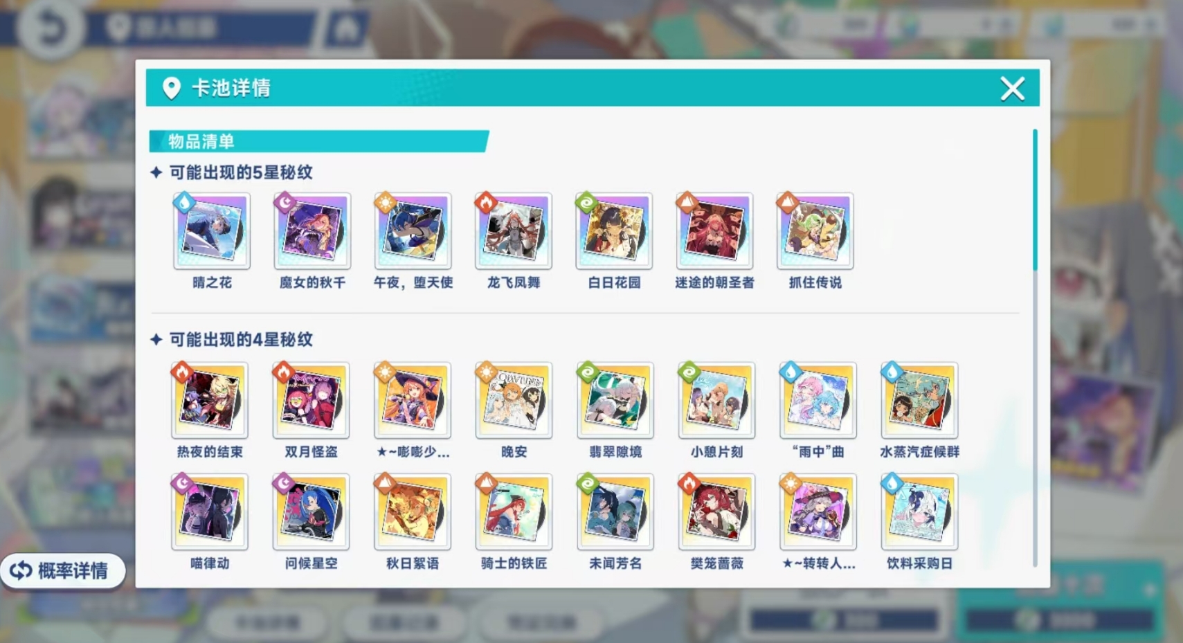 七张虹彩秘纹在强度上都处于同一水平线,在初期玩家手中虹彩秘纹数量不多的情况下,它们中的任何一张都能为队伍提供不错的增益。而到了后期时,它们也可被装配在辅位秘纹上,为主位秘纹提供音符来激活技能,所以都很好用,没有废卡的说法。但在抽取时,不建议使用珍贵的星之砂来进行追忆洄游的抽取,只建议使用该卡池的专属道具亮银闪耀来抽,尤其在保底成本较高的情况下,用星之砂抽取的性价比特别的低。