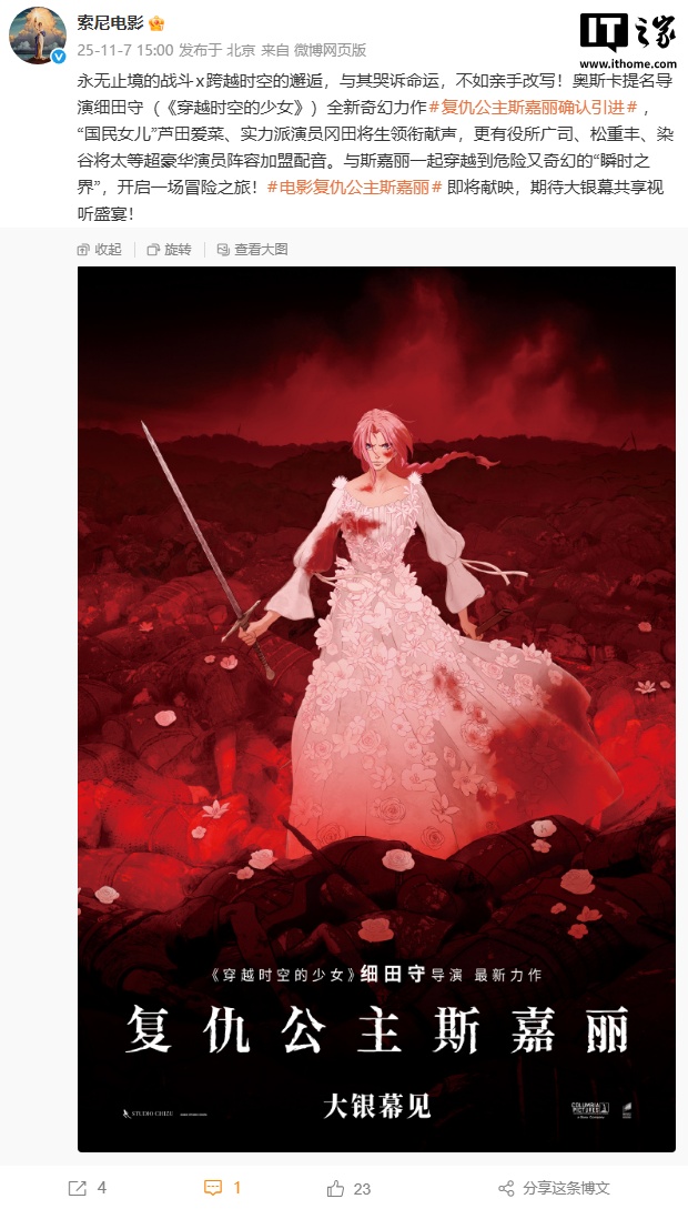 alixixi 11 月 7 日消息,索尼电影刚刚宣布,日本动画大师、奥斯卡提名导演细田守(《穿越时空的少女》)全新奇幻力作《复仇公主斯嘉丽》确认将引进中国内地,档期待定(alixixi注:日本 11 月 21 日上映)。