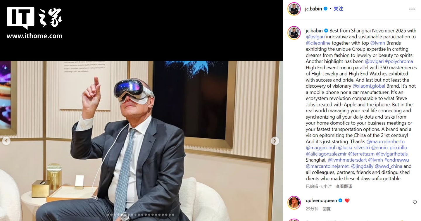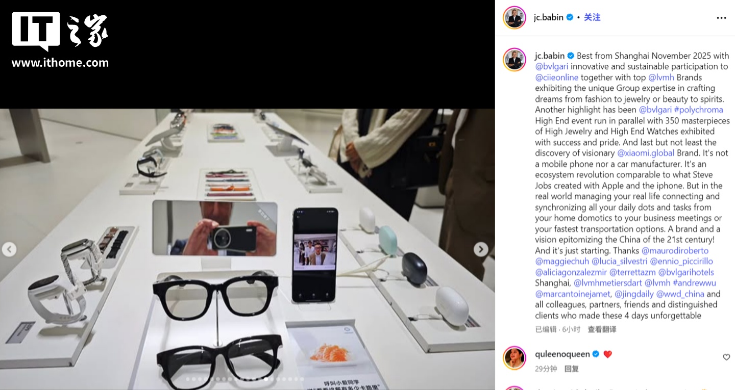 alixixi 11 月 7 日消息,LVMH 集团腕表部门 CEO 兼 BVLGARI 宝格丽 CEO 让-克里斯托夫・巴宾(Jean-Christophe Babin)今日在社交媒体平台上分享了在上海进博会体验小米汽车后的感想。