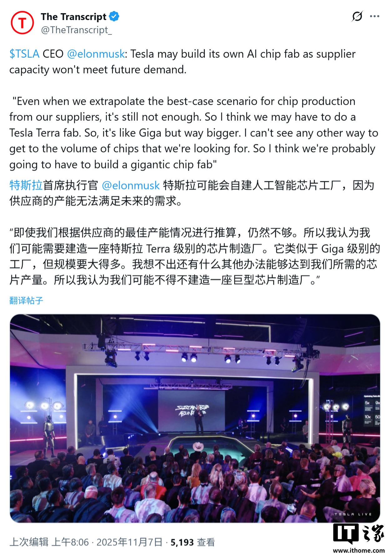 alixixi 11 月 7 日消息,科技媒体 NeoWin 今天(11 月 7 日)发布博文,报道称在年度股东大会上,特斯拉首席执行官埃隆・马斯克(Elon Musk)宣布一项重大战略:公司计划自行建造一座大型半导体工厂。