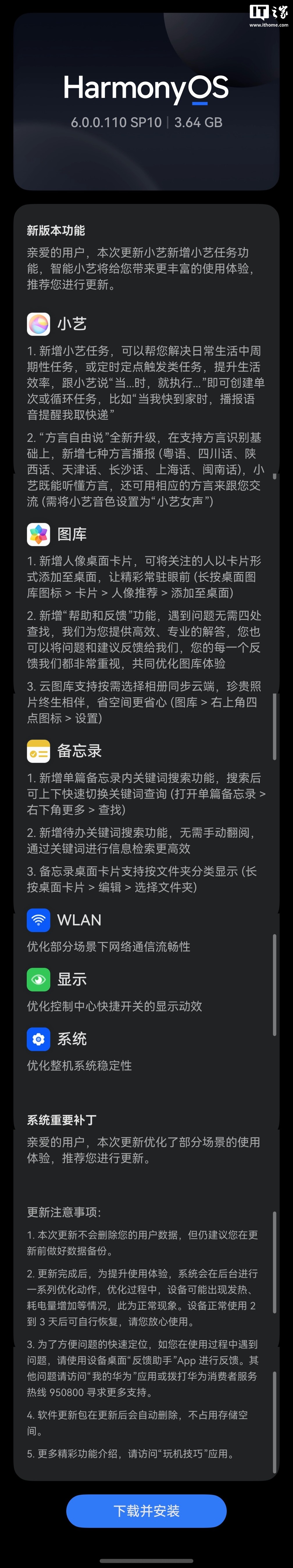 alixixi 11 月 7 日消息,华为 Mate XTs 三折叠手机现已推送鸿蒙 6.0.0.110 SP10 更新,主要为小艺语音助手新增方言播报等功能,并提升系统体验,大小 3.64GB。