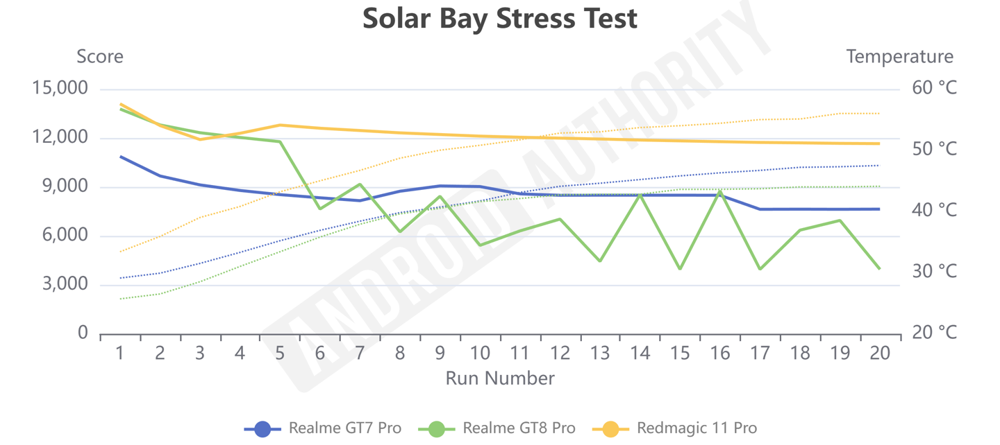 为了实现这一温控目标,realme GT8 Pro 牺牲了芯片性能。在严苛的 Solar Bay 图形压力测试中,其性能最终会降至峰值性能的 28.6%,性能损失超过七成。