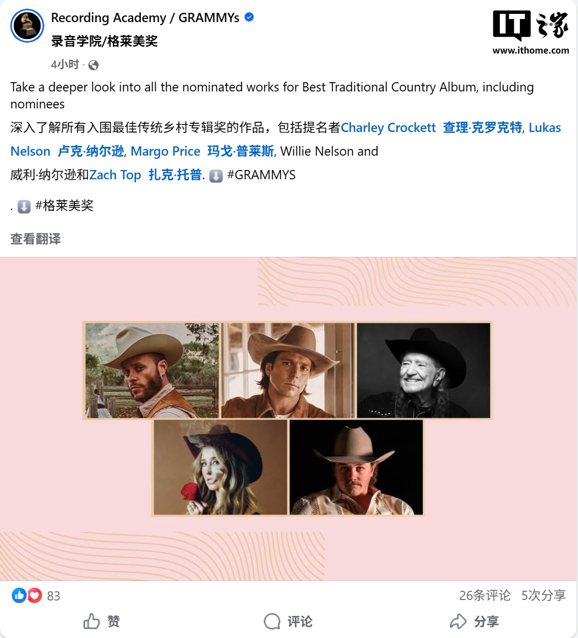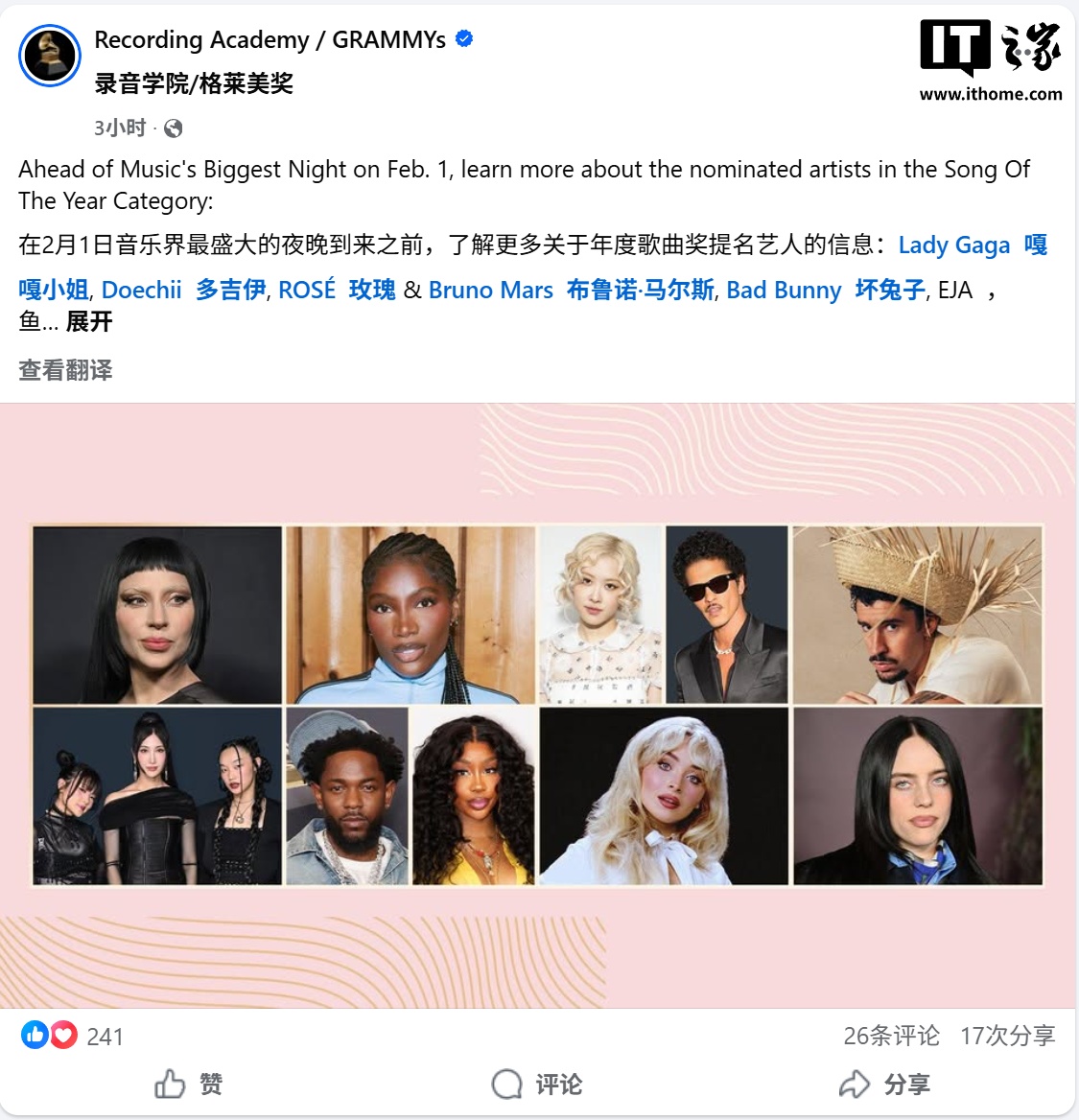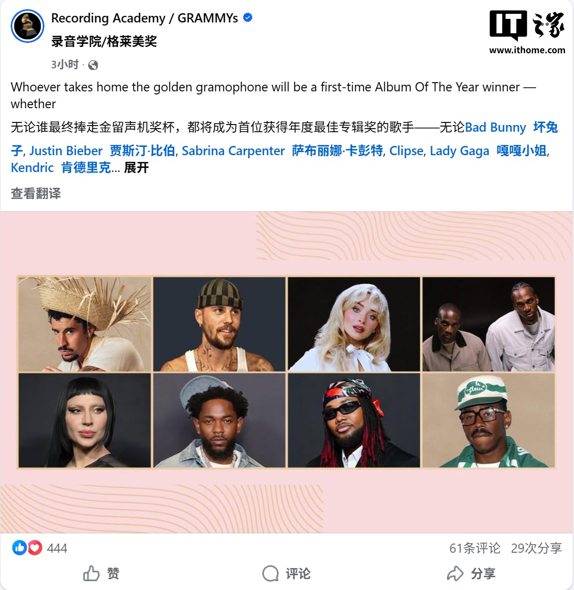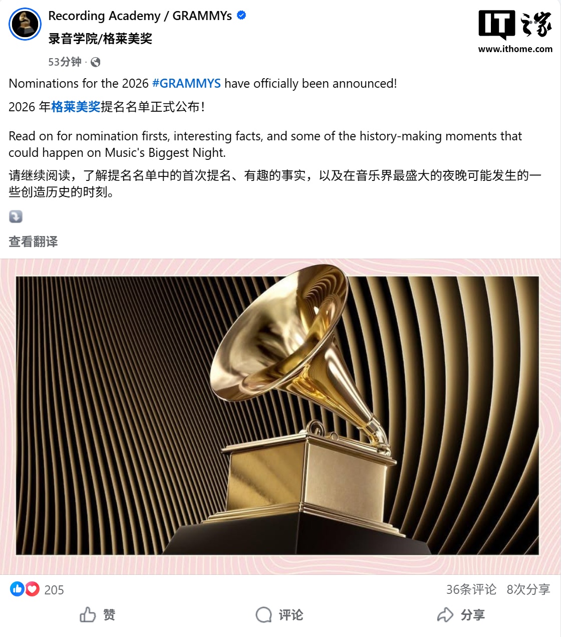 alixixi 11 月 8 日消息,美国国家录音艺术与科学学院昨日(11 月 7 日)公布了第 68 届格莱美奖的完整提名名单,苹果公司的流媒体服务 Apple TV 凭借其原创影视内容中的出色音乐表现,成功获得四项提名,彰显了其在原创内容领域的跨界影响力。