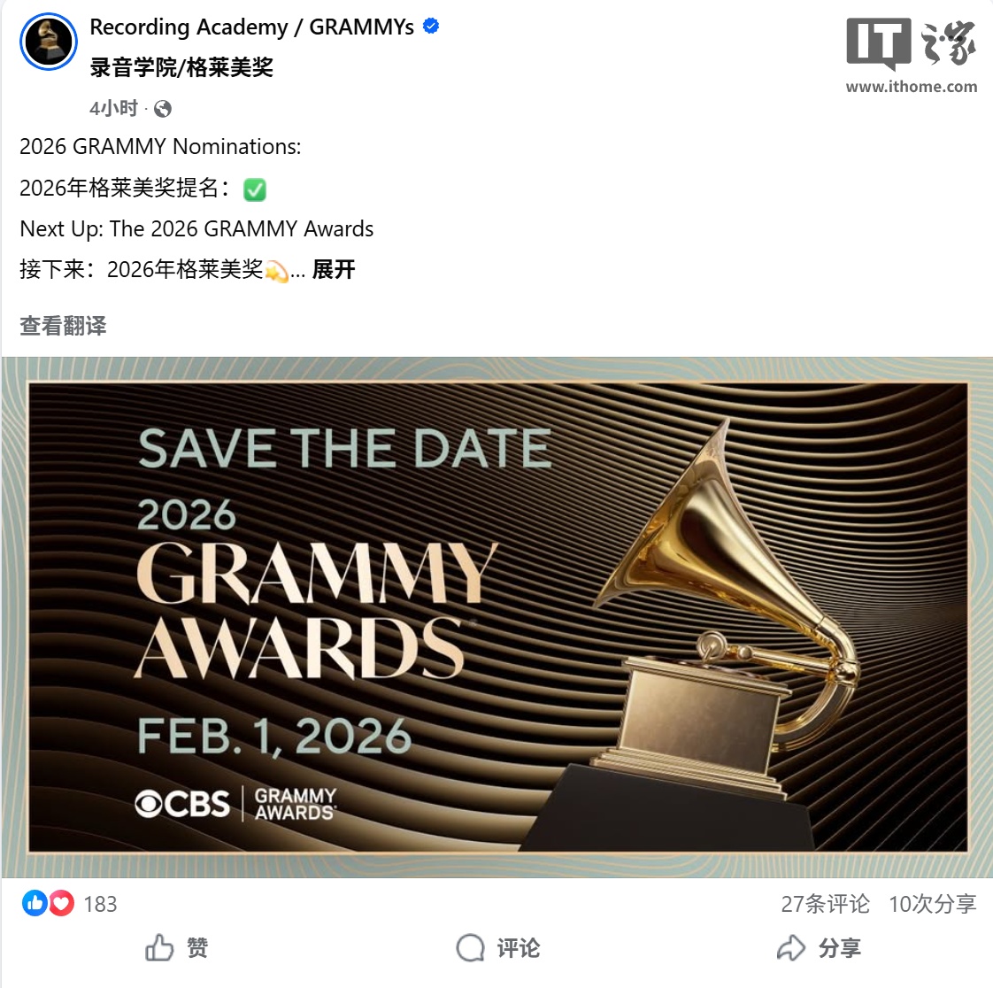 第 68 届格莱美奖颁奖典礼计划于 2026 年 2 月 1 日(星期日)在洛杉矶的 Crypto.com 体育馆隆重举行。届时,颁奖盛况将通过哥伦比亚广播公司(CBS)电视网进行现场直播,并在流媒体平台 Paramount + 上同步播出,全球音乐爱好者将共同见证各大奖项的归属。