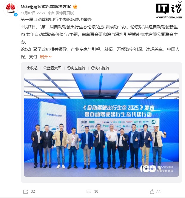 alixixi注:“第一届自动驾驶出行生态论坛”由车百会研究院与深圳引望智能技术有限公司联合主办,华为在现场正式发布《自动驾驶出行生态 2025》报告,并举行自动驾驶出行生态共建行动启动仪式。