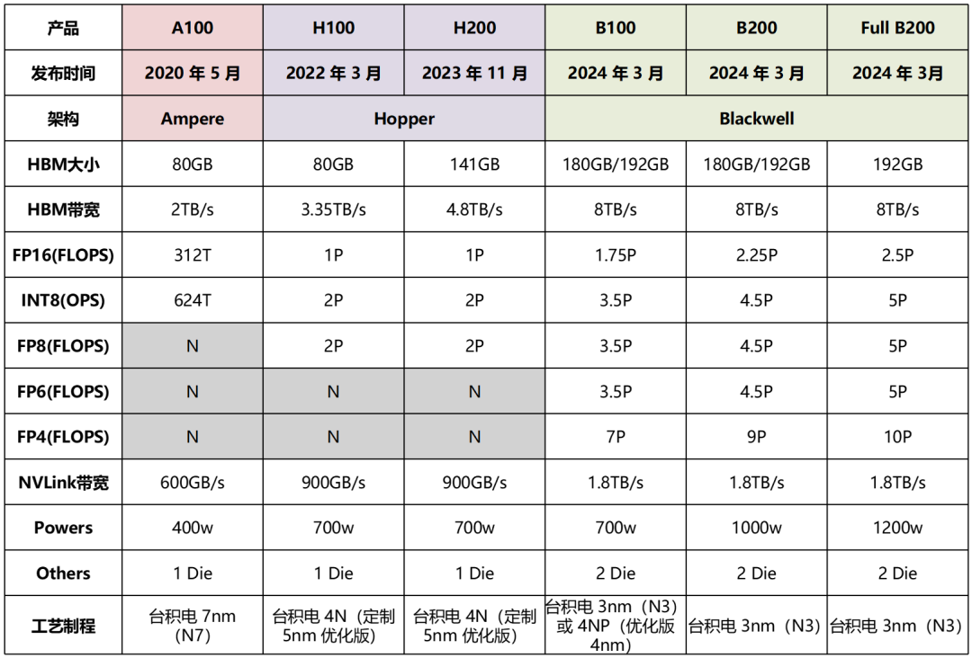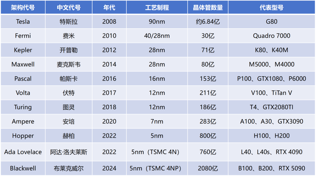 例如,基于 Volta(伏特)架构的 V100,基于 Ampere(安培)架构的 A100,基于 Hopper(赫伯)架构的 H100、H200,基于 Blackwell(布莱克威尔)架构的 B100、B200 等。