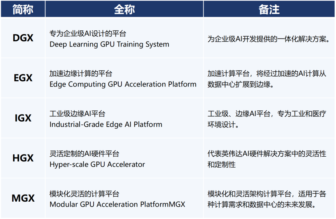 基于刚才的各种芯片平台,英伟达构建了对应的计算机平台,或者说,叫做超级计算机平台,包括 DGX、EGX、IGX、HGX、MGX 等。