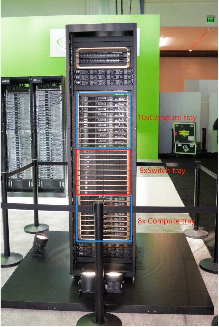 每个 Compute Tray 包括 2 颗 GB200 超级芯片。所以,就是 36 个 Grace CPU(18×2),72 个 B200 GPU(18×2×2)。