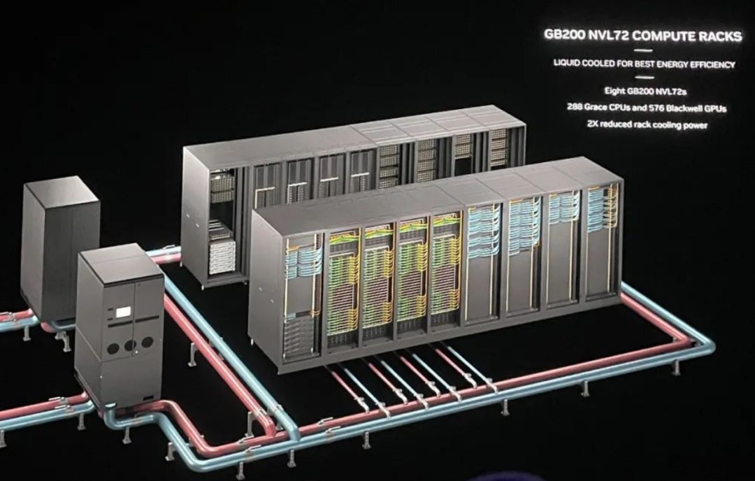 8 个 DGX GB200 NVL72,又可以组成一个 576 个 GPU 的 SuperPod 超节点。