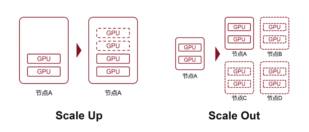 单节点内,不断加 GPU,是 Scale Up(纵向扩展)。单节点到了一定规模,就不好再增加了。就要增加节点数量,搞节点与节点之间的互连,那就是 Scale Out(横向扩展)。