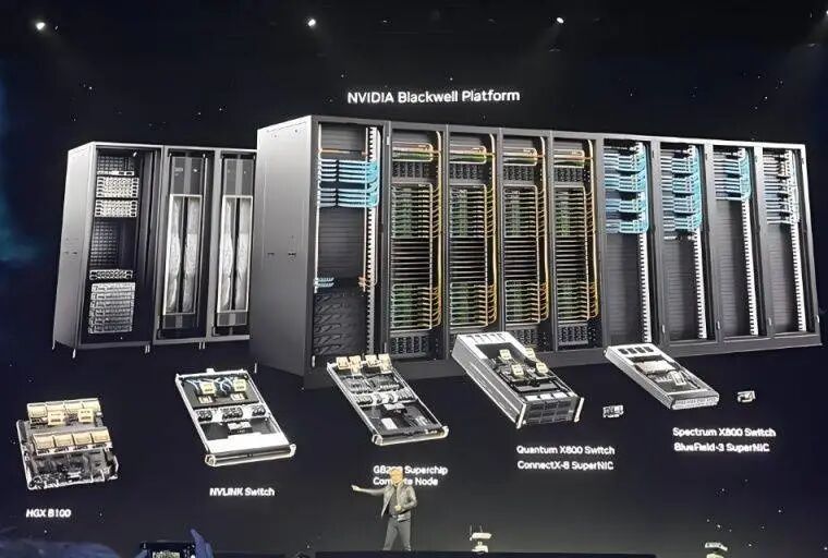 由一个 Grace CPU 和两个 Blackwell B200 GPU 组成的平台,就是 GB200(取 Grace 和 Blackwell 的首字母),据说性能是 H100 的 7 倍。