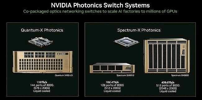 对了,前段时间,英伟达还发布了 CPO 光电一体化封装网络交换机 Spectrum-X Photonics 和 Quantum-X Photonics。