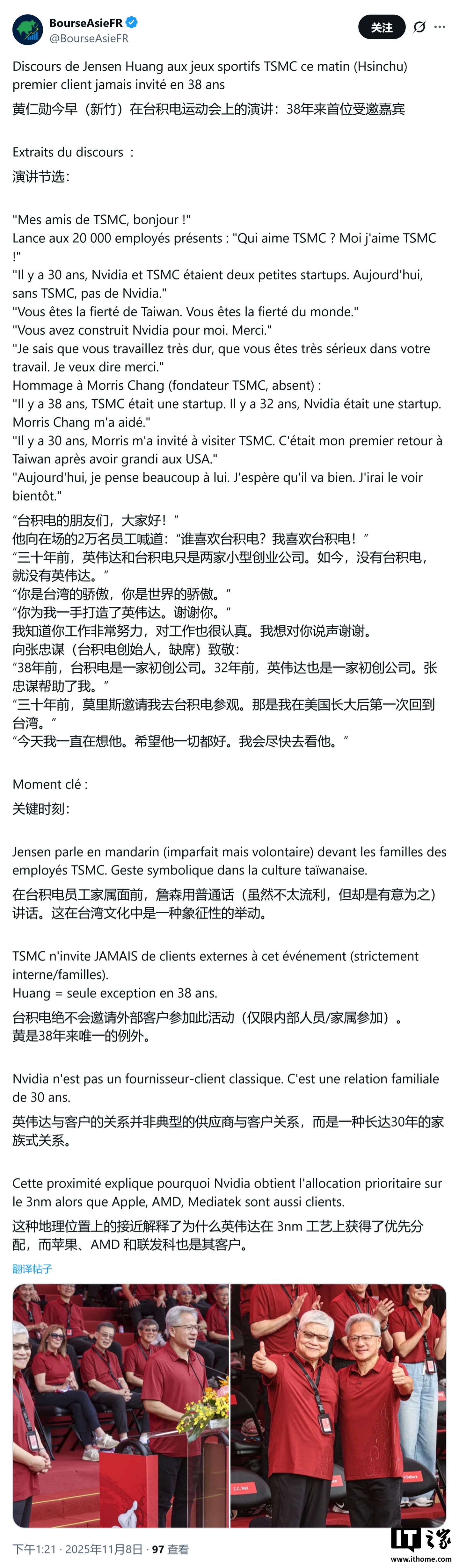 黄仁勋高度肯定了台积电的晶圆支持,并强调“没有台积电,英伟达不可能成功”。
