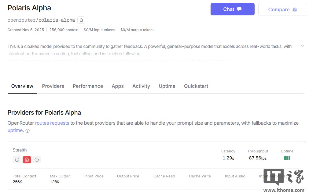 本周早些时候,一款神秘模型“Polaris Alpha”上线 OpenRouter 平台,其上下文长度达 256,000 tokens,可免费使用,在代码生成、工具调用与指令理解方面表现突出。