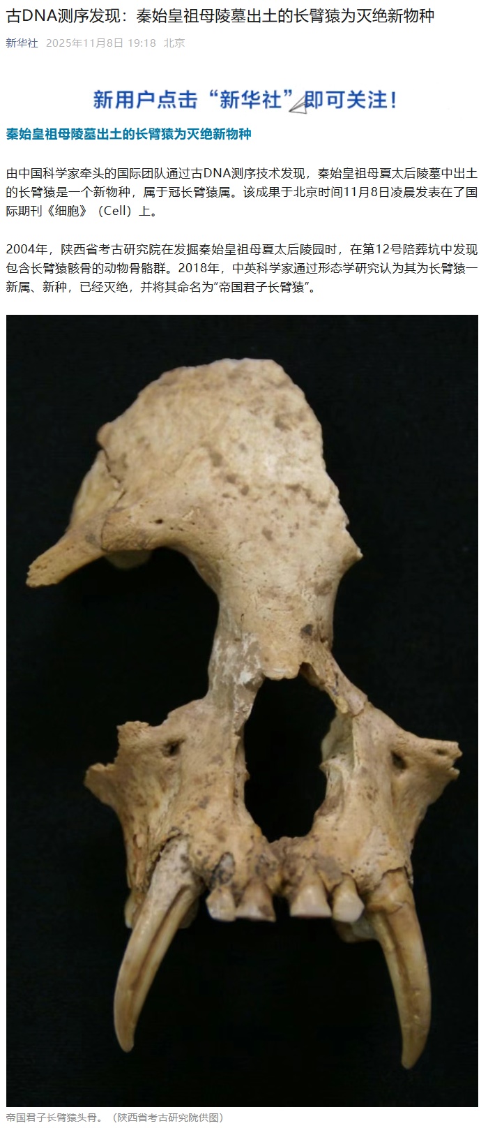 alixixi 11 月 9 日消息,据新华社报道,由中国科学家牵头的国际团队通过古 DNA 测序技术发现,秦始皇祖母夏太后陵墓中出土的长臂猿是一个新物种,属于冠长臂猿属。该成果于北京时间 11 月 8 日凌晨发表在了国际期刊《细胞》(Cell)上。