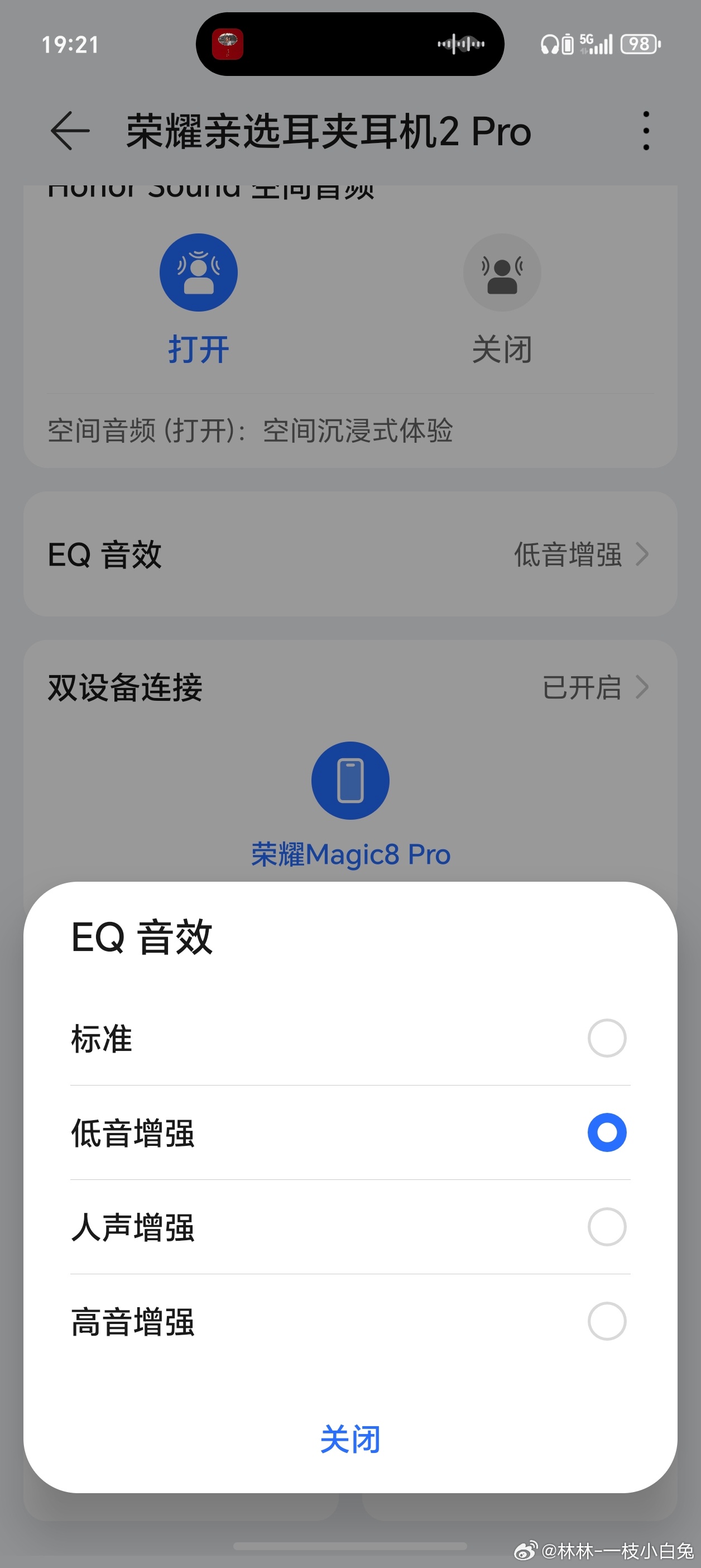 alixixi 11 月 9 日消息,荣耀中国区智慧生活业务部部长林林昨晚在微博分享了“荣耀亲选耳夹式耳机 2 Pro”的外观,以及新品的部分设置功能,称该耳机是全方位大提升,“长的很不像,其他都一样”。