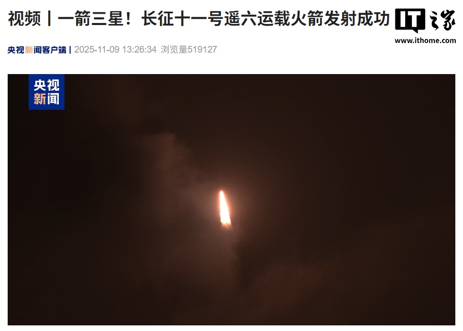 alixixi 11 月 9 日消息,据央视新闻报道,11 月 9 日 05 时 01 分,我国太原卫星发射中心在山东海阳附近海域使用长征十一号遥六运载火箭,成功将试验三十二号卫星 01 星、02 星、03 星发射升空,卫星顺利进入预定轨道。该卫星主要用于开展空间新技术试验。