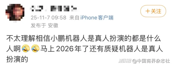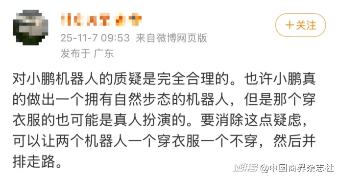 有网友评论道:“感觉是一个真人在努力扮演机器人”;还有网友质疑IRON内部藏着真人,认为它“走猫步的样子太像人了”。随后,与IRON有关的词条也冲上微博热搜榜单。