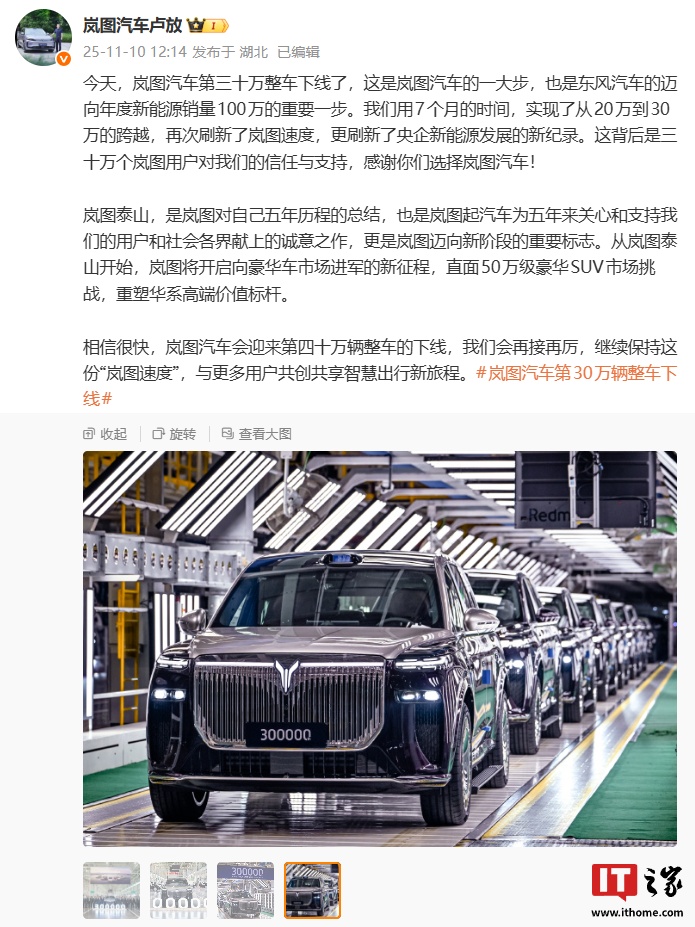 alixixi 11 月 10 日消息,东风汽车今日官宣,岚图第 30 万辆整车 —— 岚图泰山下线。东风汽车向年度新能源百万销量目标冲刺。